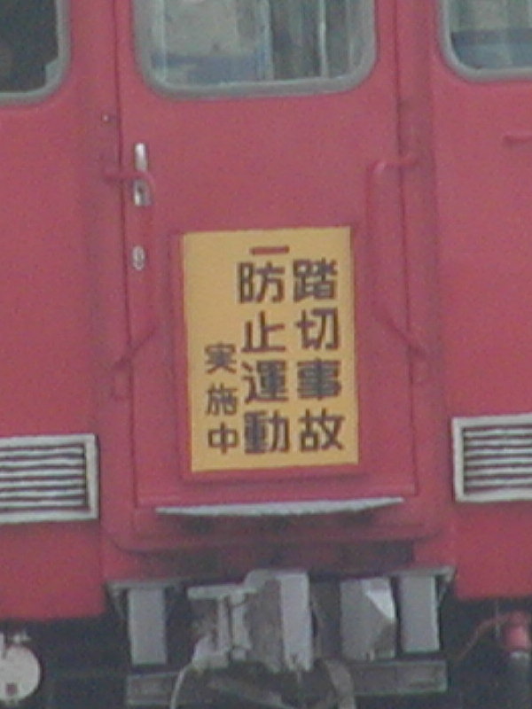 春と秋の年2回行われる踏切事故防止運動の期間中に取り付けられるヘッドマークです。 これは黄色地の板に文字のみのシンプルなタイプです。