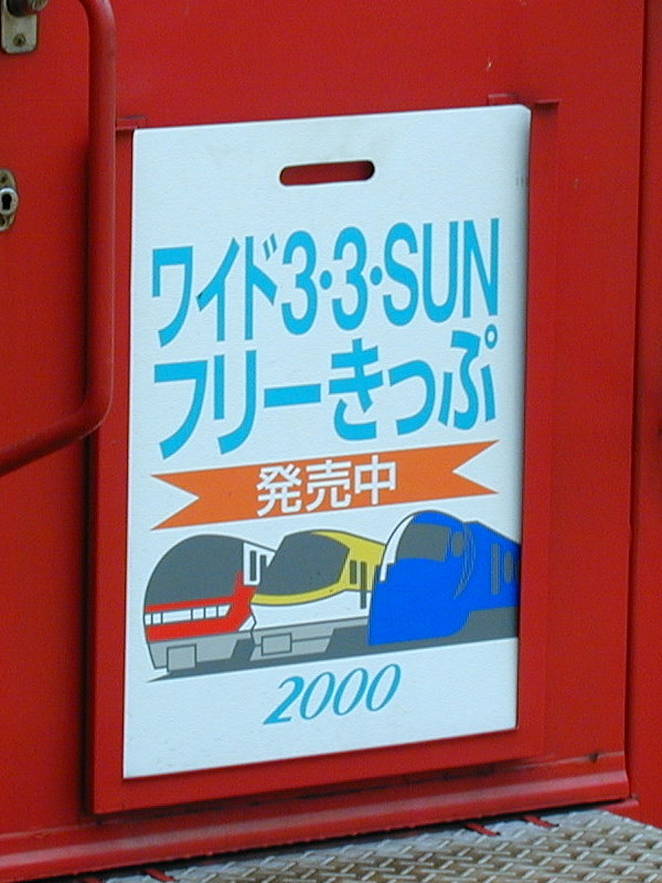 名鉄・近鉄・南海グループ各社の電車・バス・船等が3日間乗り放題の「ワイド3・3・SUNフリーきっぷ」の発売をPRするヘッドマークです。2000年に登場。