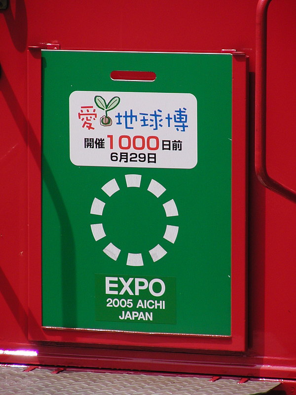 2002年6月29日に愛知万博「愛・地球博」開幕日までちょうど1000日になるのをPRするヘッドマークです。丸いサークル状の愛知万博のマークの上に6月29日に1000日前となる事を伝えるメッセージが書かれています。 ヘッドマークは2000年〜2001年に取り付けられた「愛知万博正式スタート」の物を再利用しているようで、上からステッカーが貼られているのが確認できます。